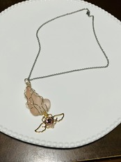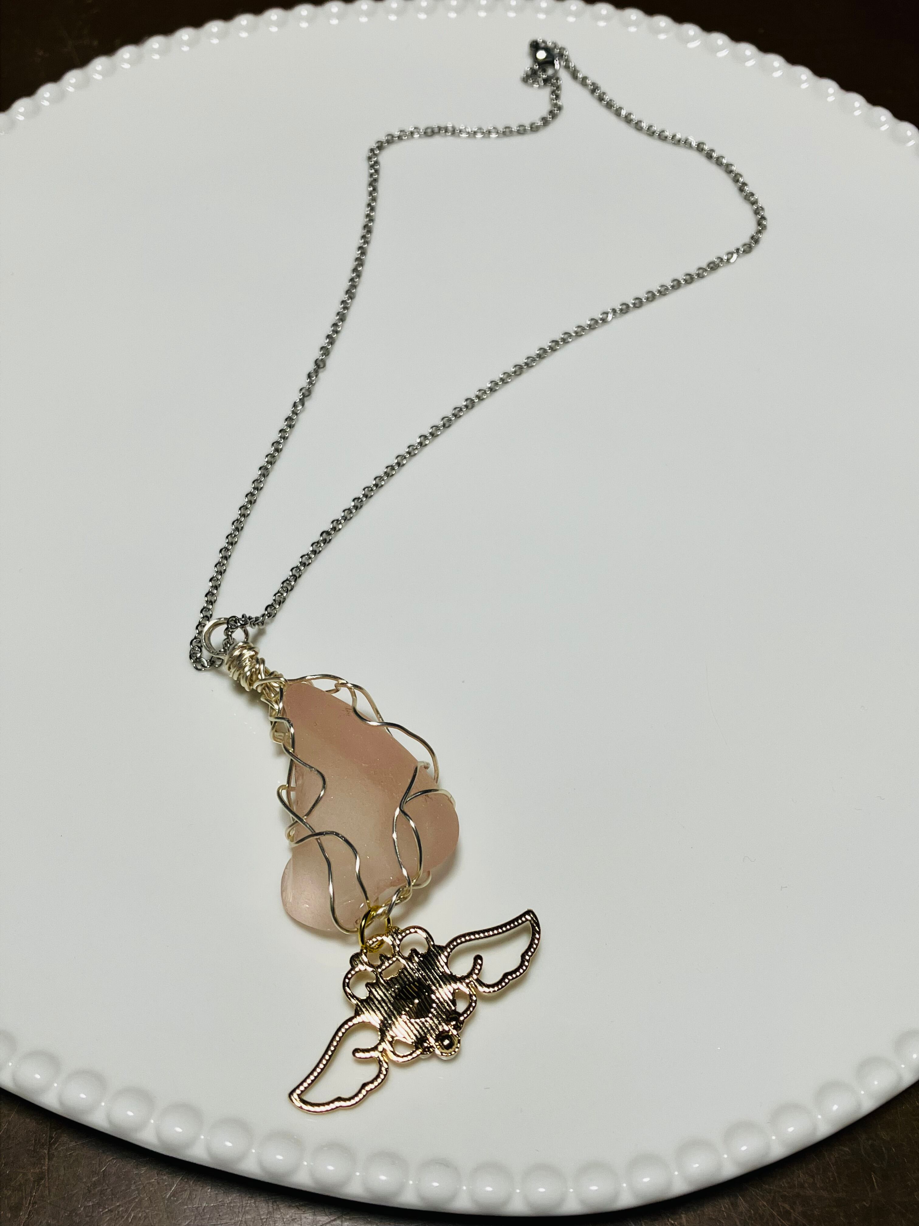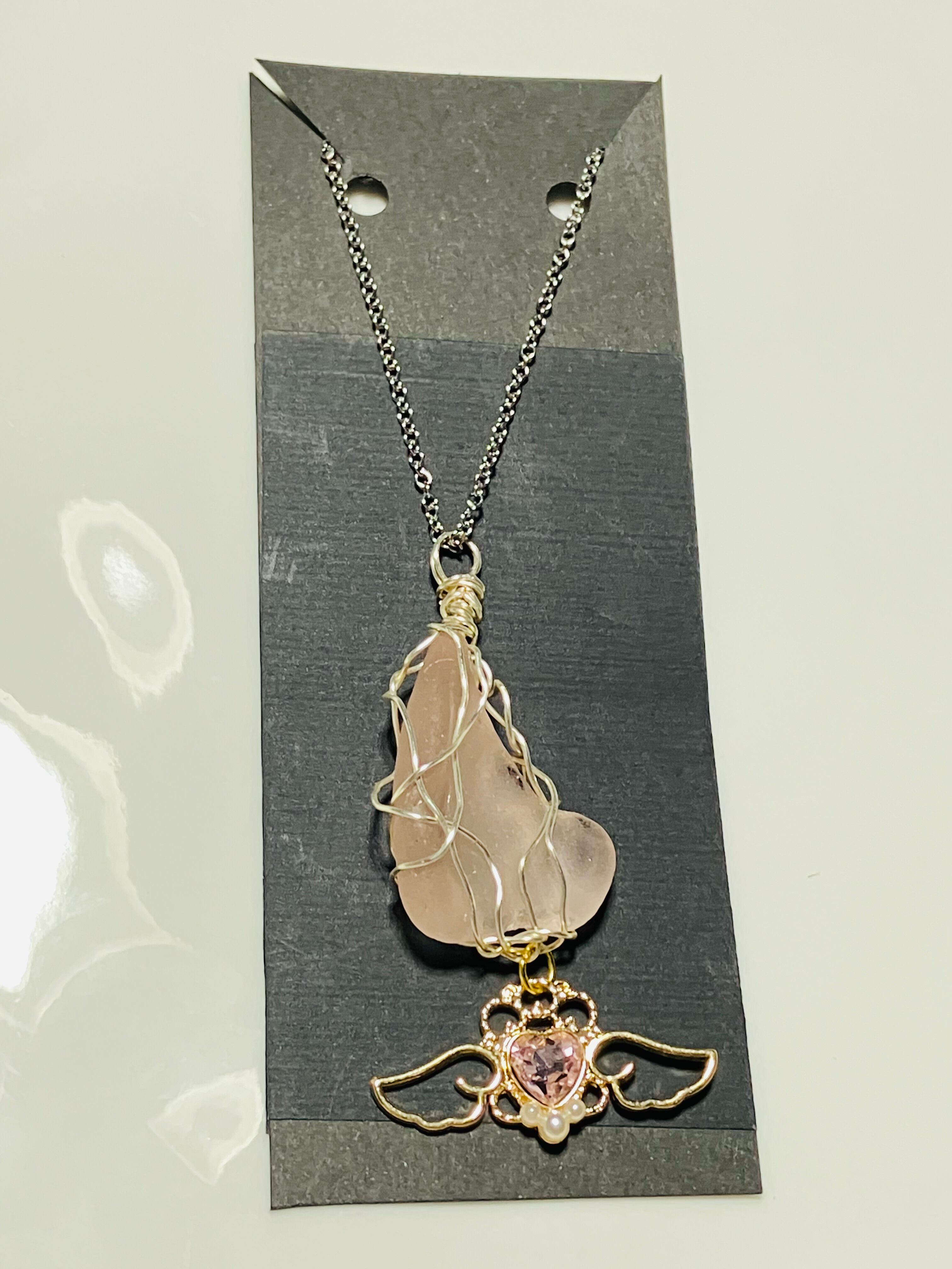 レアな薄ピンクのシーグラスを使用したネックレス「天使の囁き」です。愛らしいハートの天使モチーフがあしらわれ、シンプルながらも華やかな雰囲気を醸し出しています。このネックレスは、どんなスタイルにもマッチし、あなたの個性を引き立てる素敵なアイテムです!