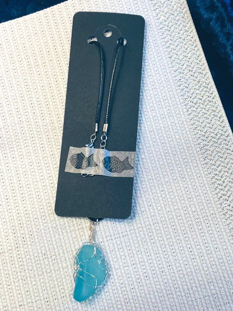 濃い水色の瓶底がシーグラスになったペンダント「多分瓶底がかけらになった青い筆先」は、独創的なワイヤーアートで美しく仕上げられた魅力的なアイテムです!