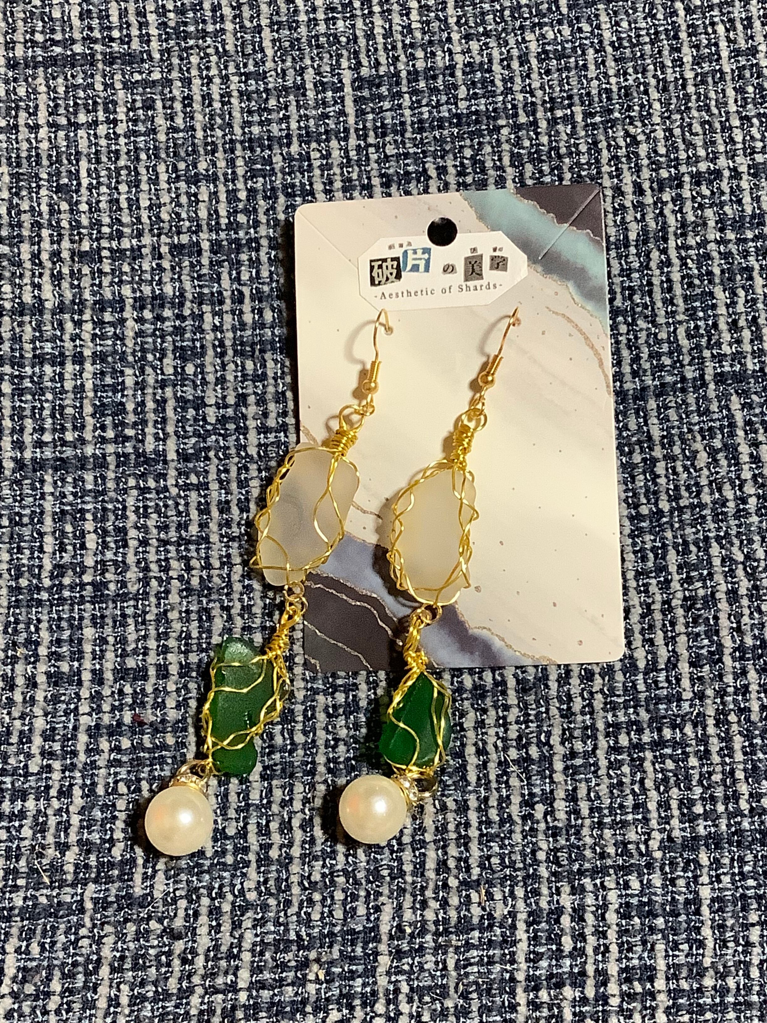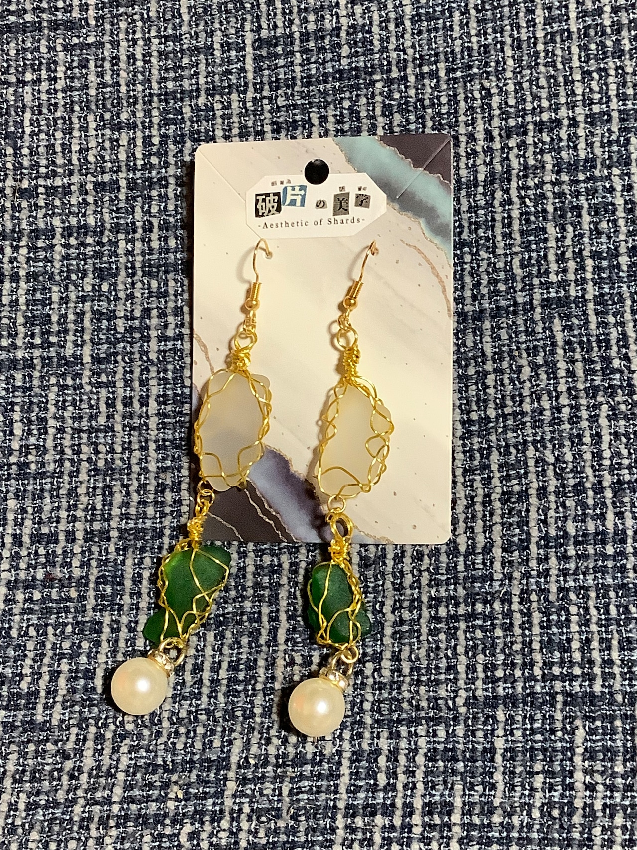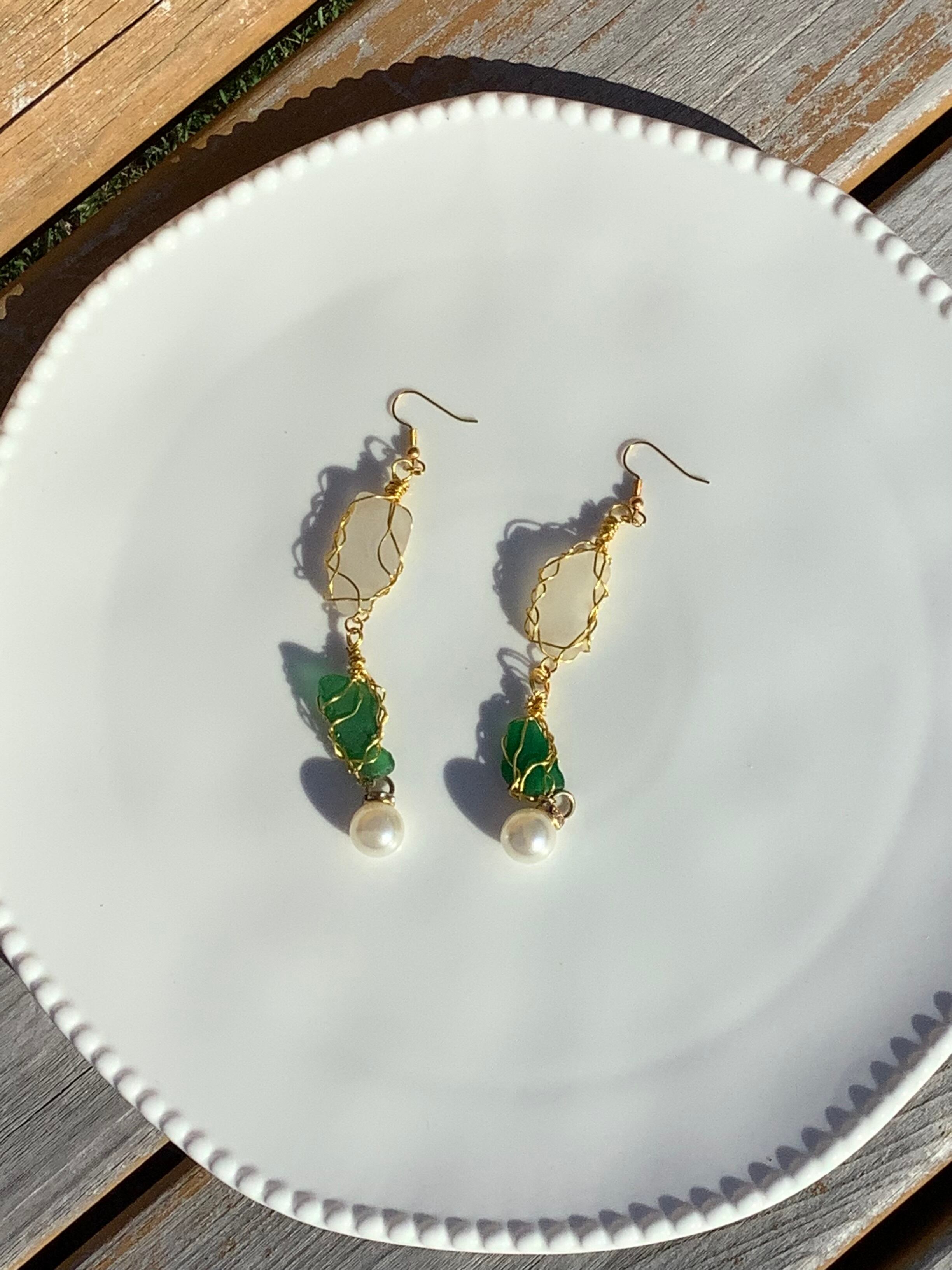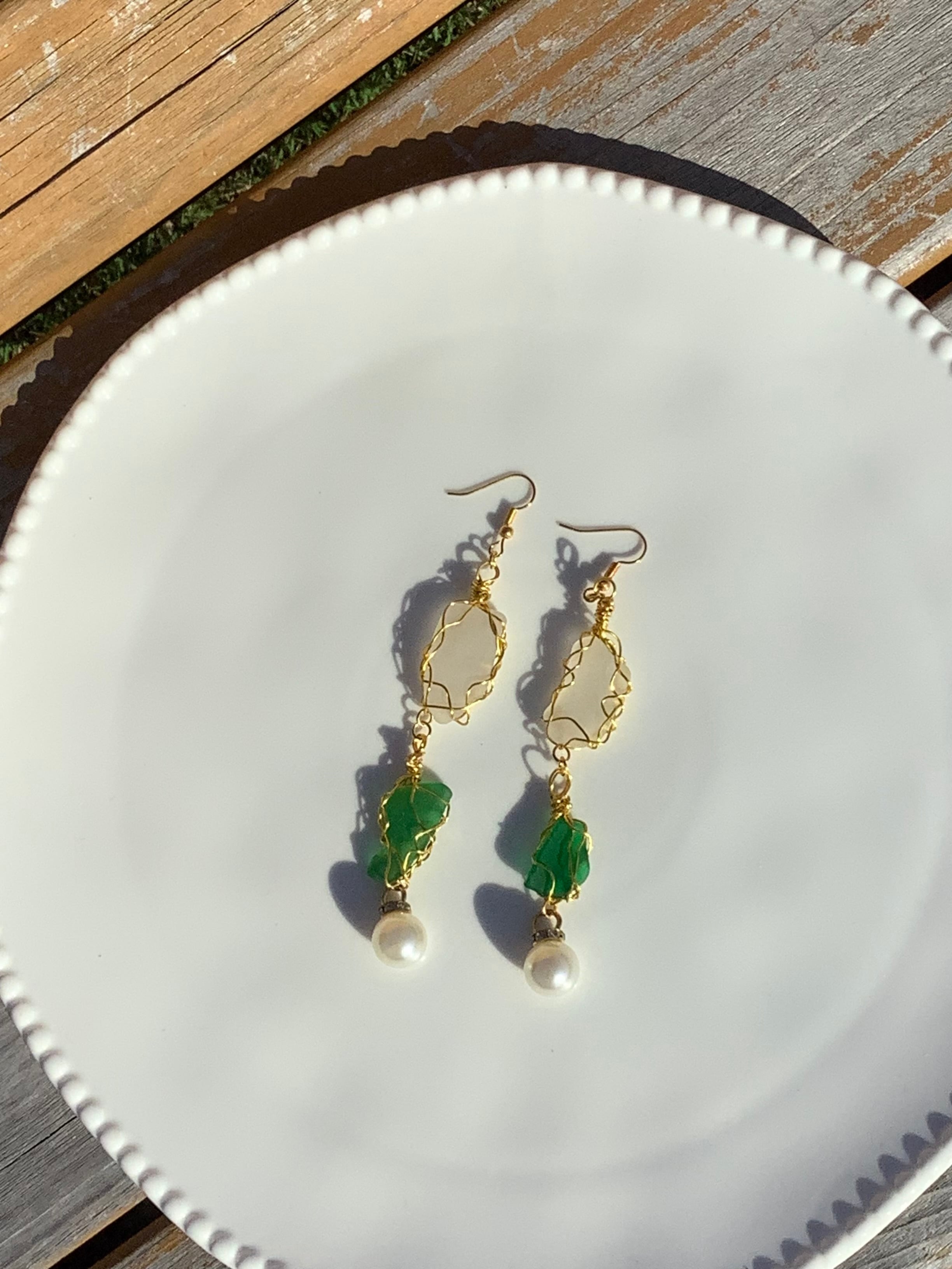 金色のワイヤーアートが施されたシーグラスが2つ連なり、フェイクパールがアクセントとなってエレガントな印象を醸し出しています!