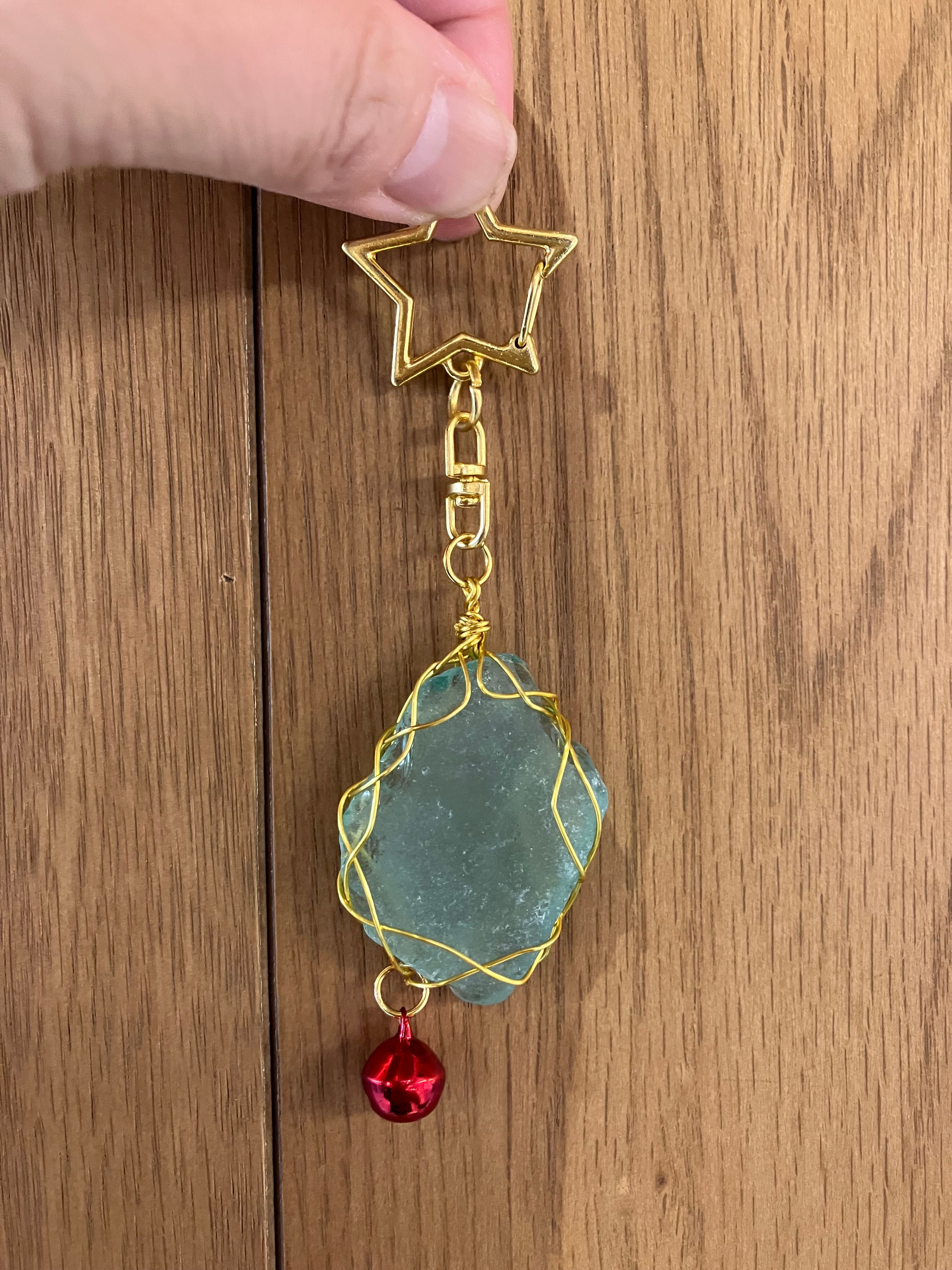 このキーホルダーは、緑のシーグラスにゴールドのワイヤーアートが美しく施され、クリスマスらしい雰囲気を演出しています。星型のゴールド金具と赤色の鈴が、見るたびに心を躍らせるデザインが特徴です。